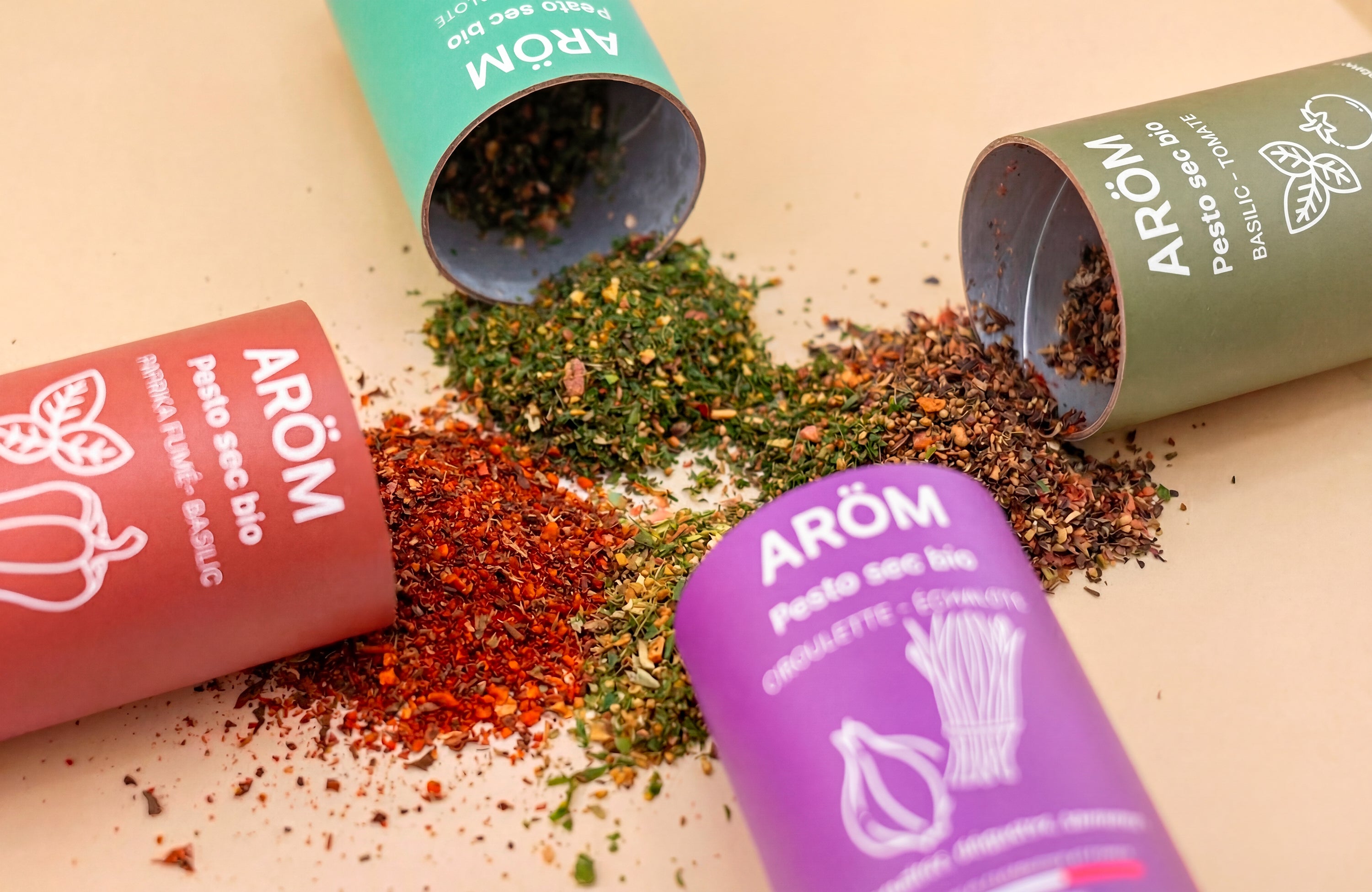 ARÖM propose des pestos secs bio qui sont 100 % naturels, sans gluten, sans sel ajouté, sans allergène, sans additif, vegan et fabriqués en France.